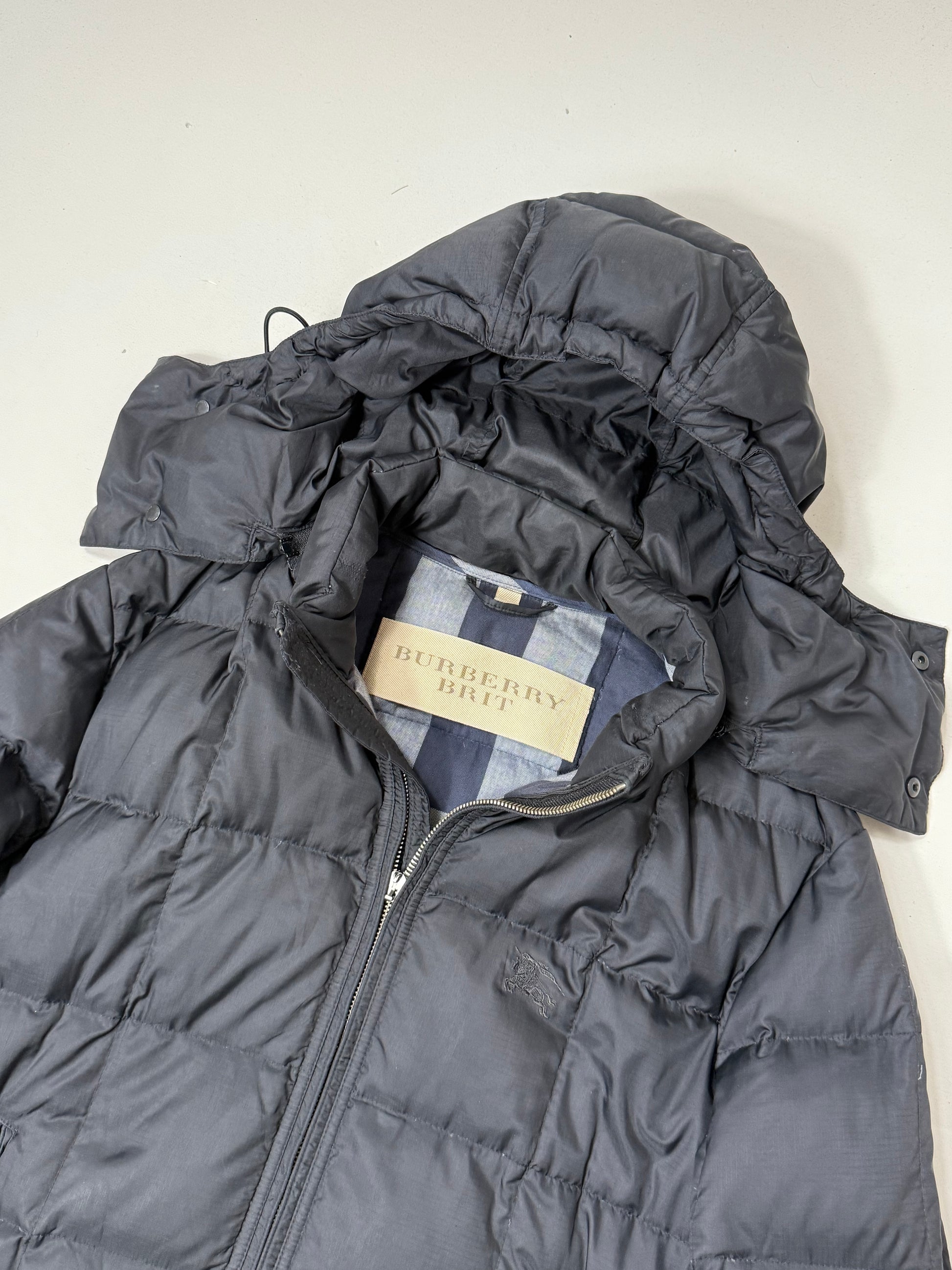Stay warm in timeless style with this luxurious Burberry down jacket for men. Crafted in sleek black, this premium winter jacket combines high-performance insulation with Burberry’s unmistakable design heritage. The inside features the iconic Burberry check pattern in a sophisticated navy tone, offering a subtle yet refined detail that sets it apart.