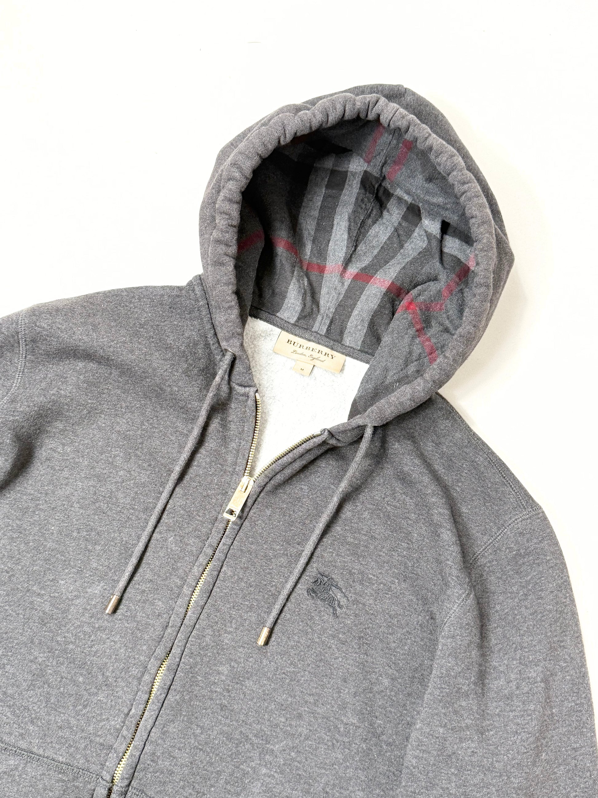 A timeless essential, this dark grey Burberry zip hoodie is crafted from soft cotton for all-day comfort. It features a subtle embroidered logo on the chest and the iconic Burberry check lining inside the hood.